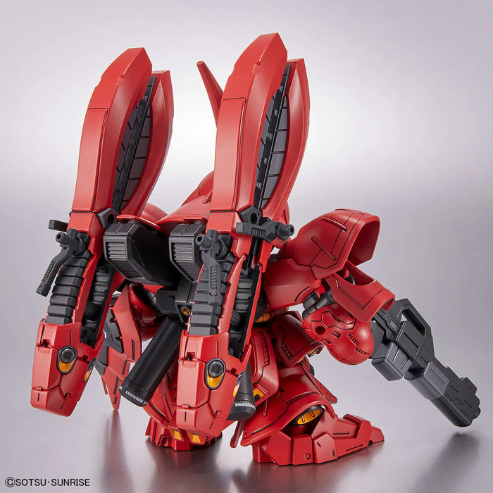 The BB Senshi MSN-04FF Sazabi comes with a variety of accessories, including the iconic beam rifle, shield, and beam sabers, all sized appropriately for the SD format. The model offers a high level of articulation, making it easy to pose in various dynamic stances. It is a fun and approachable kit for collectors and Gundam fans, delivering an enjoyable build with the charm of the BB Senshi line while still honoring the grandeur of the original Sazabi design.