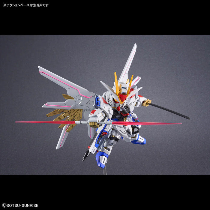 The SDCS Mighty Strike Freedom is a fun and dynamic Super Deformed model kit that combines the design of the Mighty Strike Freedom Gundam with an exaggerated, chibi-like appearance. It features vibrant colors with distinct red, white, blue, and gold accents, and is equipped with oversized weapons, including the signature beam rifles and swords. With improved articulation from the SDCS (Super Deformed Custom Scale) line, the Mighty Strike Freedom offers greater poseability, allowing for action-packed displays while retaining the playful, compact design typical of SD models. It’s a charming take on the Mighty Strike Freedom Gundam with added flair and fun details.